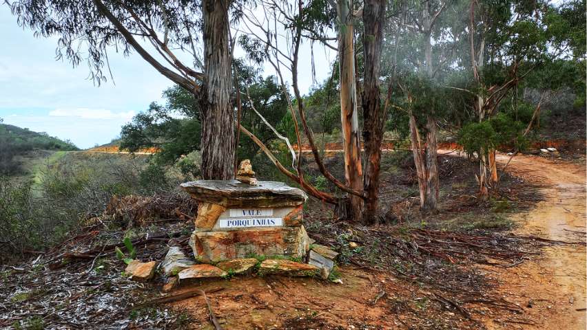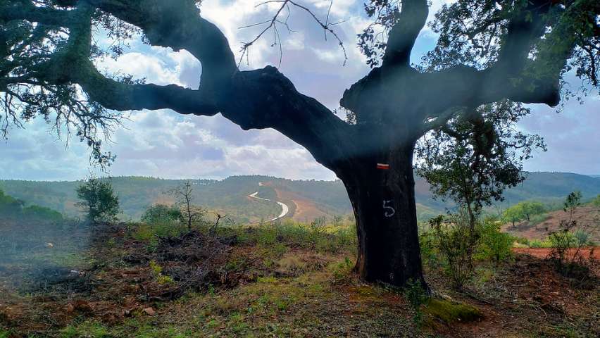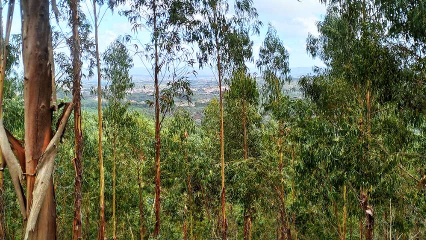 O que vemos, em primeiro lugar, é o espetáculo de uma impressionante paleta de cores de Outono. Os tons de verde estão por toda parte. Passo a passo, atravessamos folhagens escuras, verde-oliva, verde-musgo ou verde-esmeralda: a erva fresca da manhã, os arbustos, os medronheiros ou até mesmo as oliveiras. Mas também muitos eucaliptos, que têm um comportamento invasor nas florestas portuguesas, são altamente inflamáveis e, no entanto, estão por toda a parte.