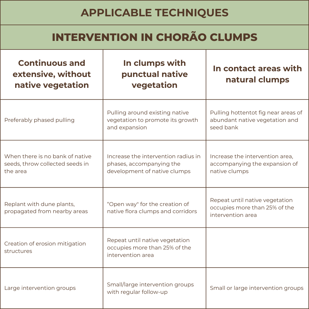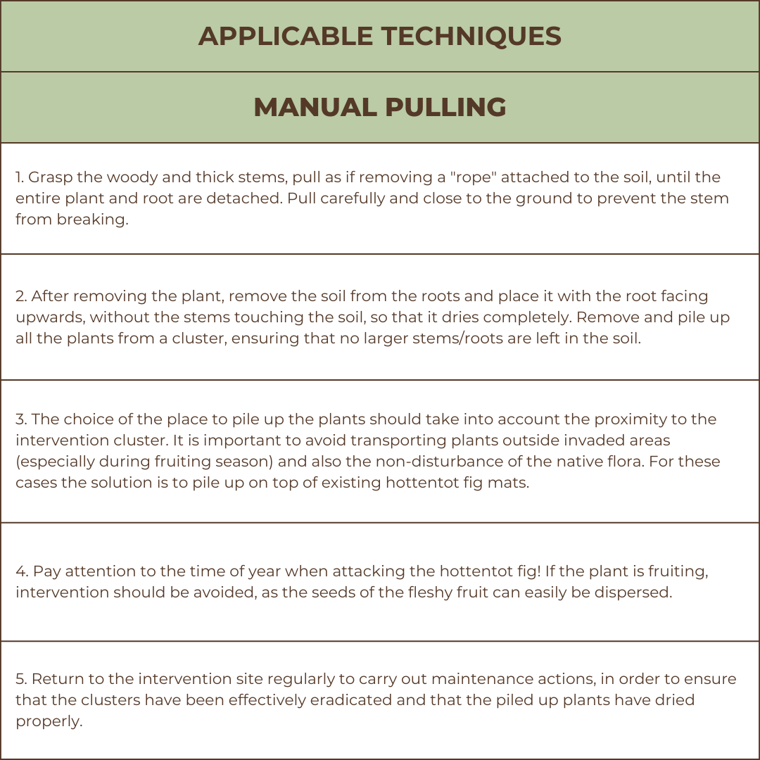Taking into account the protection of the most sensitive ecosystems and to avoid sand erosion, the two main forms of intervention in controlling hottentot fig areas are categorized: