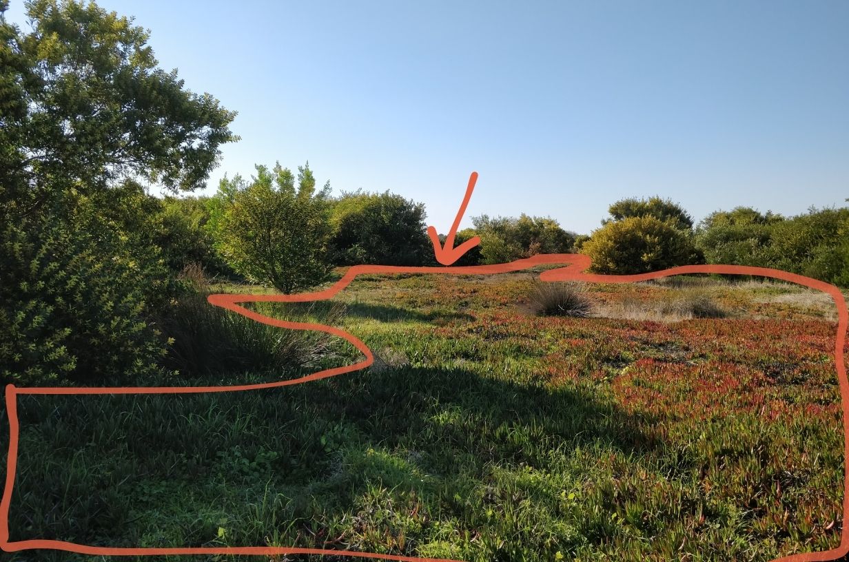 ❌ Avoid walking in areas of dense vegetation and, whenever possible, choose existing trails, vegetation-free areas or areas covered with invasive plants (e.g. the hottentot fig itself)
