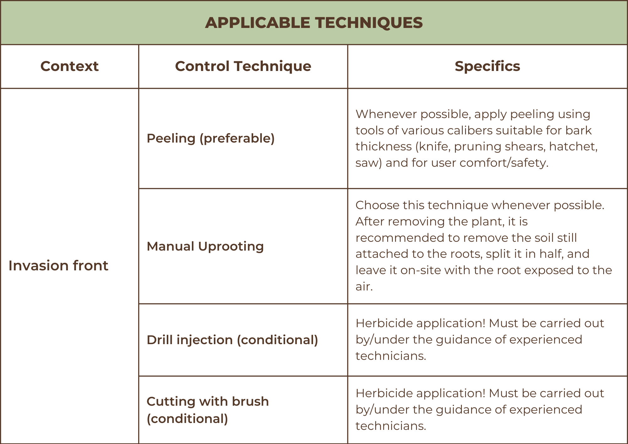 When intervening in the main invasion front, the goal is to break and push back the main fronts. These “fronts” are large monospecific patches that dominate the landscape and are often impenetrable. Observing these patches or walking inside them makes it clear that native species cannot develop during the full invasion phase, resulting in significant reduction in biodiversity.