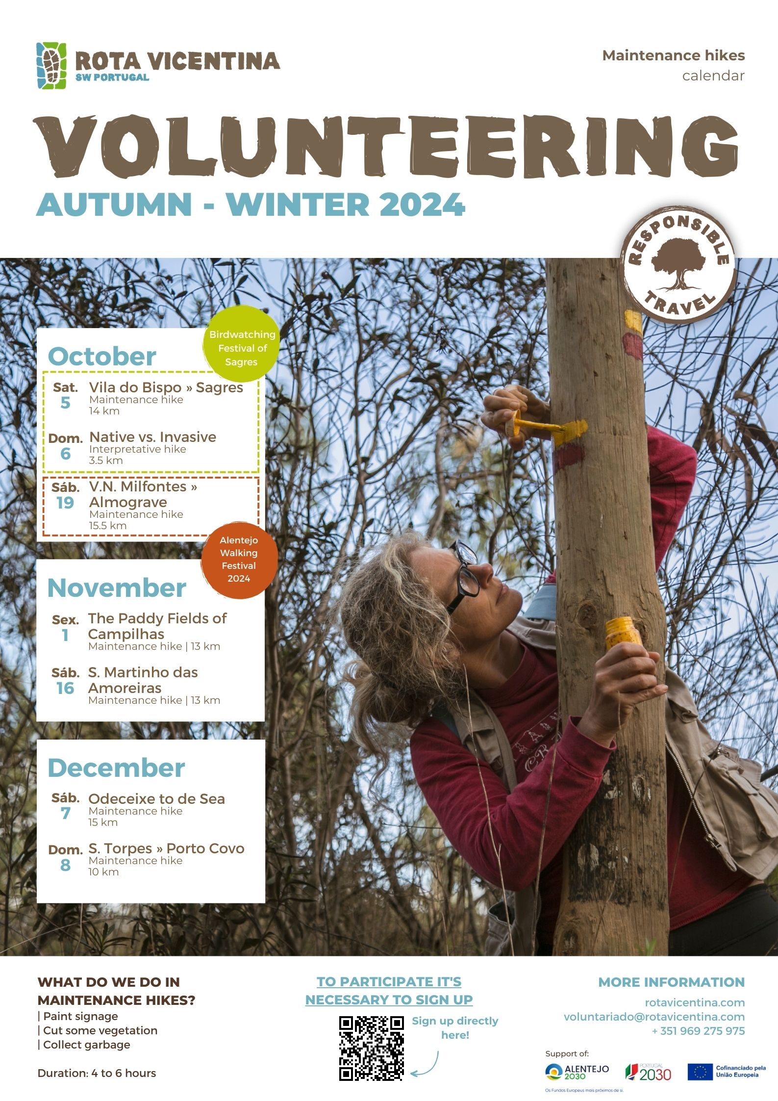 With the beginning of the walking season on the Rota Vicentina, our calendar of volunteering activities is back! This calendar includes maintenance walks throughout the Rota Vicentina territory, mainly on Saturdays and public holidays, and occasionally on Sundays. This was a successful formula last season and we intend to maintain it so that more people can join us. This season we’ve also decided to release dates only until the end of the year, but in 2025, a new calendar will be released with more activities. Stay tuned!