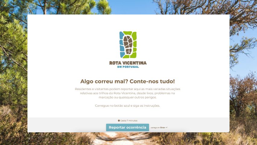 Qualquer anomalia (marcação, manutenção, conflito de utilização, atentados ao meio ambiente, etc.) será reportada através deste formulário. Caso seja um problema que não é da competência da Rota Vicentina, o mesmo será reportado à autoridade que tratará de acompanhar e resolver a anomalia.